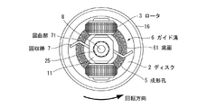 本ペレット成形装置は、円筒形のハウジング1を有し、このハウジング1内に、ディスク2、ロータ3およびカッター4を備える。ディスク2は、円盤形で、水平に設けられており、多数の上下に貫通する成形孔5を有する。ディスク2の上面には円形のガイド溝6が形成されており、成形孔5はガイド溝6の底面61に設けられている。そして、ディスク2の中心を主軸8が上下に貫通しており、主軸8のディスク2より上側に、略肉厚円筒形のロータ支基11が挿入されている。ロータ支基11は、キー材24を介することで上下移動可能に設けられている。そして、ロータ支基11の側面の軸対称の位置に、二本のロータ軸9が主軸8と直交する向きに取り付けられており、各ロータ軸9の先端に、ベアリング10を介してロータ3が回動自在に取り付けられている。なお、ロータ軸9のロータ支基11への取り付けは、螺合や、嵌合など、どのような方法でもよい。ロータ3はディスク2上面のガイド溝6に嵌り込んでガイド溝6の底面61に接地しており、主軸8が回転することによって主軸8の周りを公転しつつ、ディスク2上面を転動する。主軸8の上端には、二個のナット25を螺合して、いわゆるダブルナットとして固定してあり、ロータ支基11の上方への移動を規制している。ロータ支基11の下方への移動はロータ3がガイド溝6の底面61に接地することで規制されるものであり、ナット25の固定位置を変更することで、ロータ支基11の上下移動の幅、すなわちロータ3とガイド溝6の底面61との隙間の最大値を調整できる。また、ロータ支基11の下端からは回収棒7が外周側に延びている。回収棒7は、ロータ軸9と上面視して垂直になる位置に二本設けられており、ロータ3とともに主軸8の周りを回転する。なお、ロータ3、ガイド溝6および回収棒7の構成の詳細は後述する。