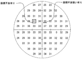 とが表示されるようにすると良い。図4は、その表示の一例を示す図であり、図中の2桁の数字は、閾値検査における各測定ポイントの測定結果(つまり、個々の視標Aに関連付けた視野判定結果)を示し、“27”を囲む四角の記号は“固視不良有り”を示す指標であり、“32”に引かれた二重下線は“固視不良疑い有り”を示す指標である。なお、このように判定基準を2つ設ける場合(つまり、該2つの判定基準を使って“固視不良有り”“固視不良の疑い有り”“固視不良無し”の3段階の判定を行う場合)には、“固視不良有り”の場合の指標と、“固視不良疑い有り”の場合の指標とをモニター手段7に表示することで、より情報量が多くすることができる。