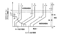 前記図7の実線Aは、車両の発進/走行用(以下、走行用という)の駆動力源をエンジン8と電動機例えば第2電動機M2とで切り換えるための、言い換えればエンジン8を走行用の駆動力源として車両を発進/走行(以下、走行という)させる所謂エンジン走行と第2電動機M2を走行用の駆動力源として車両を走行させる所謂モータ走行とを切り換えるための、エンジン走行領域とモータ走行領域との境界線である。この図7に示すエンジン走行とモータ走行とを切り換えるための境界線(実線A)を有する予め記憶された関係は、車速Vと駆動力関連値である出力トルクTOUTとをパラメータとする二次元座標で構成された駆動力源切換線図(駆動力源マップ)の一例である。この駆動力源切換線図は、例えば同じ図7中の実線および一点鎖線に示す変速線図(変速マップ)と共に記憶手段56に予め記憶されている。