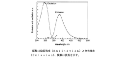 また、薄膜での吸収スペクトルは図1に、励起スペクトルおよび発光スペクトルは図2に示す。