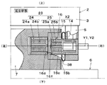 前記一方(左)の枢支部X1は、図1、図8及び図9に示す如く、前記モータMの出力軸であって支持体6の膨出部7の一方側面7cから更に一方の方向(左方向)へ向かって突出する一方枢軸10と、一方の取付用腕部4に設けられ、軸装部13a及び軸装部13aへ一方枢軸10を出し入れするための一方枢軸出入用開口部13bを有する一方軸受部13と、一方枢軸出入用開口部13bを通過させて一方枢軸10を入れた軸装部13aを一方枢軸10の突出先端側(左側)へ向かって押圧する押圧手段40と、軸装部13aへ挿着した一方枢軸10が抜け出すのを防止するための軸抜け防止手段26とを備えている。なお、一方の枢支部X1は、前記信号伝達部20の一次信号コイル21(図1参照)を一方軸受部13に備えると共に、二次信号コイル22を一方枢軸10側となる膨出部7の一方側面近傍に備えている。