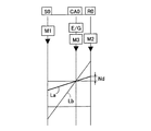 上記を図9を用いて具体的に説明する。図9は、差動部11の各回転要素の回転状態を示す共線図であり、図3に対応するものである。ここで、図において左側に位置する縦線が第1電動機M1が連結された差動部サンギヤS0の回転状態を示しており、中央がエンジン8および第3電動機M3が連結された差動部キャリヤCA0の回転状態を示しており、右側に位置する縦線が第2電動機M2が連結された差動部リングギヤR0の回転状態を示している。例えば、エンジン停止制御前において、差動部11が実線Laに示す回転状態で回転中に、自動変速部20が動力伝達遮断状態(ニュートラル状態)でエンジン停止制御が開始されると、差動部リングギヤR0のイナーシャが小さい一方、差動部キャリヤCA0のイナーシャがエンジンイナーシャの影響で差動部リングギヤR0よりも大きくなるので、第1電動機M1から出力される負トルクの勢いで、破線Lbに示すように差動部リングギヤR0の回転速度が上昇させられる。