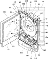 図1と図2に示すように、本体枠30の前面の片側には、同本体枠30の上端から下部前面板110にわたる部分を覆うようにしてガラス扉130が扉開閉用ヒンジ機構120によって前方に開閉可能に装着されている。ガラス扉130のヒンジ機構と反対側に自由端側の後側には、本体枠30に設けられた扉施錠フック141に係脱可能に係合してガラス扉130を閉じ状態に施錠する係止部(図示しない)が設けられている。