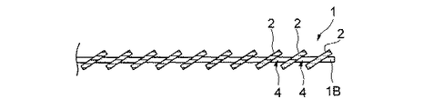 図6〜図8において、アルミニウム、銅、あるいはそれらの合金などの良熱伝導性金属からなる方形状の金属板に、その平行な2辺に沿った縁部1A,1Bを残して、その2辺に対し直角な方向に細長く伸びる多数の切起し(ルーバー切起し)2が、前記両縁部1A,1Bに対して平行な方向に並ぶように傾斜状に切起されて、ルーバータイプの放熱フィン1が形成されている。ここで、隣り合うルーバー切起し2同士の間の空間は空気やLLC等の冷媒が流通する通路4となっている。