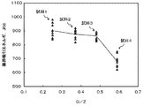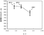 図4は、試料5〜試料7における限界吸収エネルギ耐量試験の結果を示す図である。図4に示すように、アンチモン酸亜鉛(Zn7Sb2O12)を主成分とするスピネル型粒子の平均粒径Sと酸化亜鉛粒子の平均粒径Zとの比(S/Z)が小さくなるに伴い、限界吸収エネルギ量が高くなることがわかった。特に、S/Zの値が0.35未満となる条件では、限界吸収エネルギ量が高く、優れたエネルギ耐量を有する電流−電圧非直線抵抗体が得られることがわかった。