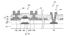 コンタクト部140は、下側電極142と、下側電極142と電気的に接続された上側電極144とを有している。下側電極142はゲート電極122とともに絶縁基板101上に設けられている。なお、絶縁基板101は透明であり、例えば、ガラス基板である。あるいは、下側電極142はゲート電極122とともに絶縁基板101上に設けられたベースコート層(図示せず)上に設けられてもよい。