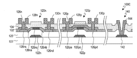 次に、図14(k)に示すように、フォトレジストマスクP2を剥離し、半導体層126および第2層間絶縁膜104を覆う上側導電層を堆積し、上側導電層を所定の形状のフォトレジストマスク(図示せず)を利用してエッチングすることにより、ソース領域126ns、126ps、ドレイン領域126nd、126pdと電気的に接続されたソース電極128n、128pおよびドレイン電極130n、130pと、下側電極142と電気的に接続された上側電極144とを形成する。以上のようにして半導体装置100Cが形成される。なお、半導体装置100Cに図6に示した容量結合部160がさらに設けられてもよい。