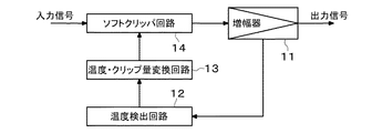 温度検出回路12は、増幅器11の温度に応じて抵抗値が変化するサーミスタ等の温度検出素子を用いて構成され、温度検出素子の抵抗値が、増幅器11の温度が所定の温度制限値Tc以上のときの抵抗値である場合に、該抵抗値の変化に応じて変化する電圧を温度検出信号として、温度・クリップ量変換回路13に供給する。温度・クリップ量変換回路13は、該温度検出信号に基づき、上述のダイオードにおける他端の電圧を該温度検出素子の抵抗値の変化に応じてリアルタイムで連続的に変化させる制御電圧を、クリップ量を表すものとして生成し、ソフトクリッパ回路14に供給する。