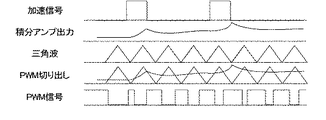 積分アンプ13の出力は比較器15に入力され、14の三角波発生器で生成された三角波と比較した値を出力することでPWM信号を作り出している。信号の関係は図3に示すとおりである。14、15をまとめてPWM生成手段16とする。このPWM信号は7のコイルに電流を流すための4のSWに入力され、所望の電流がコイルに流れるようになっている。モータがこのとき発生する出力トルク(負荷)T、トルク定数KT、モータに流れる電流をIとすると、以下の式が成り立つため、加速減速信号により、モータの速度を制御することが可能となっている。