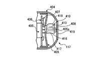 LED413が発光した光は、回転反射部材410の内側の鏡面416によって反射されてから、開口部417を介して回転反射部材410の外部へ至る。回転反射部材410の外部へ至った光の一部は、ハンドルカバー404を透過して操作ハンドル117の外部へ至り、別の一部は固定反射部材409に入射する。