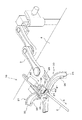 リニアスライダ45の前端部には、リニアスライダ45に対して垂直に支持軸49が設けられている。逆コの字状をなすナックル部50が、支持軸49に対して回転可能に支持されている。ナックル部50の開口側の両端部には、支持軸49と垂直となる同一の軸上に上下一対となる雌ねじ孔51が形成されている。ねじ孔51に一対のボールプランジャー52が螺入される。ボールプランジャー52は、その先端のボールで六面体状の外形形状を有するホルダー53を回転可能に支持する。