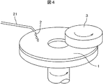 次に、第2の工程で行われる研磨スラリーを使用した研磨粒子の固定化方法について説明する。固定化方法の概要を図4に示す。研磨粒子を分散したスラリー2を研磨定盤1上にチューブポンプ21を用いて滴下しながら、かつ高純度アルミナを基材とした研磨粒子固定化治具3を、該定盤1上に設置し、適宜該治具3上に錘を乗せるなどして荷重を印加しつつ、定盤1を回転させた。定盤回転数は100rpm以下で調整した。