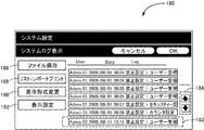 操作者が上位管理者であった場合は上位管理者用設定画面160を表示する。操作者はこの画面で、システム設定に関する操作を行なう(ステップS1018、1020)。上位管理者用設定画面から行なった操作は、上位管理者の行なった操作としてシステムログファイルに記録される(ステップS1021)。上位管理者設定画面において、システム設定ログ表示ボタン168が押された場合には、デジタル複合機30はシステムログ表示画面180を表示し、システムログ記録部に記録されている上位及び下位管理者モードで行なった操作情報を閲覧させる(ステップS1022、1024)。上位管理者設定画面において、ログアウト又は終了が選択された場合には、ログアウト情報をシステムログファイルに記録後システムログの取得を終了し、一般ユーザモードに移行する(ステップS1026、1016)。