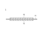 図1は、本発明の好適な一実施形態(以下、第一実施形態とも称する)である双極型リチウムイオン二次電池用電極を示す概略図である。双極型電極1は、集電体11の片面に正極(正極活物質層)13を設け、もう一方の面に負極(負極活物質層)15を設けた構造を有している。そして、集電体11は、正極活物質層および負極活物質層に熱融着により接着している。集電体が活物質層に熱融着で結合することで活物質層−集電体間の抵抗を下げることが可能となり、また、活物質層−集電体間の剥離強度が向上する。第一実施形態においては、集電体は導電性を有する樹脂層から構成される。
