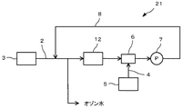 図3は、本発明の別の実施形態であるオゾン水の製造装置を示したものである。このオゾン水の製造装置21は、純水配管2に純水を供給する純水供給手段3と、オゾンガス配管4にオゾンガスを供給するオゾンガス供給手段5と、純水配管2とオゾンガス配管4とに接続され、純水とオゾンガスとを混合してオゾン混合水とするエゼクタ6と、オゾン混合水を吸引、吐出して撹拌するポンプ7と、ポンプ7から吐出されたオゾン混合水の全部を、純水配管に循環が可能なように設けられたバイパス流路8と、純水配管2のバイパス流路8との接続部の後段であって、エゼクタ6の前段に設けられた気液分離手段12と、純水配管2のバイパス流路8との接続部の後段であって、気液分離手段12の前段に設けられたオゾン水をユースポイントまで供給するオゾン水配管と、から構成されているものである。