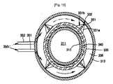 上記の中央貫通孔内に気密に挿入され、開閉部材の下部に洗浄水の漏出を防止する為の中央円筒部が形成されて、又洗浄水供給ラインの連結部が設置され、ねじによって上記の固定部材の下端に固定される下部部材をもっと含むことを特徴とする洗浄水の噴出装置。 - 第16項に置いて、上記の噴出ヘッドの円柱空間部内に挿入され、回転駆動手段の作動を円滑にできるように、洗浄水の流動方向を変化させる為の案内部が上記の開閉部材の開閉部の外周から突出されるように形成されることを特徴とする洗浄水噴出装置。
