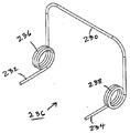 引張ばね236は、好ましくは、0.020ステンレス鋼ピアノ線又は機能的に等価な材料から作られるべきである。図11に更に十分に示されるように、それは、中央の支承面230と、支承アーム232及び234と、ねじりリング(torsion rings)236及び238とを備える。図4に示される、ねじりばね236は、ねじりリング236及び238が解放レバーの輪軸ピン316及び315と係合するように、解放レバー214の頂部に取り付けられる。ねじりばね214の支承アーム232及び234は、解放アーム214の肩240及び242に当接する。或いは、解放レバーの爪を付勢して自動締付け機構の爪車歯と係合させるために、圧縮ばね又は板ばねを使用してもよい。