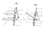 図3A・B は肘あて1に連動してローラー荷台5が上下する動作を説明する図である。左右の肘あて1及びローラー荷台5は、別個に動かすことができ、左右の上下運動を交互にしたり、同時に動かすなど、使用者が自由に動かすことができる。