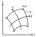 ここで、FEMモデルの各要素Mは、図4に示されるような四角形からなる。本解析においては、図4に示されるxy直交座標系における四角形の各頂点座標(x、y)を、図5に示されるように正規化されたξη座標系の座標(ξ、η)に変換する。この変換は、座標変換の関数Ni´を用いた以下の式7を用いて行われる。