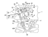 また、シリンダヘッド10及びホルダ20には連続可変動弁機構40が設けられている。連続可変動弁機構40は、カムロブ41を備え第2ホルダ22に支承されたカムシャフト42と、第2ホルダ22に支承されたロッカーシャフト43によって一端を揺動自在とされた第1ロッカーアーム44と、連結ピン45によって第1ロッカーアーム44の他端と一端が揺動自在に連結され、上面に摺動面46aを有し他端が後述のプッシュロッド24の他端に当接可能な第2ロッカーアーム46とを有する。また連続可変動弁機構40は、連結ピン45によって軸支され、カムロブ41と当接可能に設けられたローラベアリング47と、そのローラベアリング47や第1ロッカーアーム44、第2ロッカーアーム46を下方に押圧する押圧手段48と、第2ロッカーアーム46の他端に上端が当接可能に配置されたプッシュロッド24と、棒状のバルブステム49Aと一体で当該バルブステム49Aの軸方向へ往復移動可能に設けられプッシュロッド24の下端にバルブステム49Aの図1に示される上端たるステムエンド49aが当接可能なバルブ49と、制御アーム51とを有する。ロッカーシャフト43は支承部材に相当する。