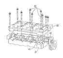 次に、押圧手段48(図1)を構成するアジャストスプリングの一端を、ローラベアリング47や第1ロッカーアーム44、第2ロッカーアーム46の連結部分に当接させるようにして第2ホルダ22に固定する。次に、制御シャフト50を第2ホルダ22の上方において支承した状態とし、図8〜図9に示されるように、制御シャフト保持ホルダ60により制御シャフト50を保持した状態とする。以上の工程を経て、連続可変動弁機構40を有する内燃機関用エンジン1の部分が組み立てられる。