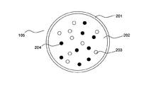 マイクロカプセル型電気泳動表示装置101において、マイクロカプセル表示層109に含まれるマイクロカプセル105は、例えば、図2に模式的に示すように、メタクリル酸樹脂、ユリア樹脂、アラビアゴム等をカプセル殻201とし、その内部に酸化チタンからなる白の粒子203とカーボンブラックからなる黒の粒子204が、シリコーンオイル等の透明で粘度の高い分散媒202に分散された状態で封入されているものである。