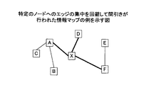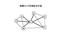 情報マップでは、図の可読性を高めるために、図を簡略化することが重要である。図の簡略化のためにエッジの間引きを行う技術が開発されている。エッジの間引きでは、関連の弱いエッジから順番に削除していく方式が一般的である。しかし、単純な間引き方式では特定のノードにエッジが集中してしまう可能性があった。その結果、ネットワーク図として意味の無い(情報量の無い)情報マップになってしまうことがあった。例えば、図2は、特定のノードにエッジが集中した情報マップの例を示す図である。図2のような情報マップでは、情報要素Xが他の情報要素と関係を有していることしか示されていない。 In the information map, it is important to simplify the diagram in order to improve the readability of the diagram. In order to simplify the drawing, a technique for performing edge thinning has been developed. In thinning out edges, a method of deleting in order from weakly related edges is common. However, there is a possibility that edges are concentrated on a specific node in the simple thinning method. As a result, the information map may be meaningless (no information amount) as a network diagram. For example, FIG. 2 is a diagram illustrating an example of an information map in which edges are concentrated on a specific node. The information map as shown in FIG. 2 only shows that the information element X has a relationship with other information elements.
