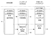 図4は本発明に係わる、保存される情報を保存場所に対応させて表記した図である。同図に置いて記号41は本体に記憶される全本体記憶情報。記号42はバックアップEEPROMに保存が可能なバックアップ可能情報。記号43は本体記憶情報の内、バックアップEEPROMには保存出来ない、あふれ情報。記号44は、バックアップEEPROMに保存出来なかったあふれ情報を含めて、外部にバックアップする為の外部バックアップ情報である。
