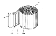 図4に、シート体をなす濾材22を巻回する際の接着剤223、224の配設位置を示している。なお、図4では、濾材22の中心に芯材を設けず、濾材22を円柱状に巻回する場合を示している。