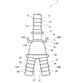 【解決手段】配管に接続され、当該配管の流体流路に連通する流体流路11を有する配管接続部10と、チューブ100A及び100Bに各々接続され、チューブ100A及び100Bの流体流路に連通する流体流路31A及び31Bを各々有する分岐部30A及び30Bと、配管接続部10と分岐部30A及び30Bとの間に位置し、流体流路11、31A及び31Bと連通する流体流路51を有する連通部50を備え、配管接続部10は、基端側に接続用治具110が挿入される被挿入部15を有し、被挿入部15の基端に接続用治具110と係合可能な係合部13を形成した。