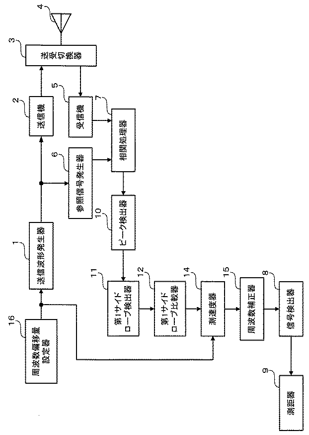 1 送信波形発生器、2 送信機、3 送受信切換器、4 空中線、5 受信機、6、6B 参照信号発生器、7 相関処理器、8 信号検出器、9 測距器、10 ピーク検出器、11 第1サイドローブ検出器、12 第1サイドローブ比較器、13 データ合成器、14 測速度器、15 周波数補正器、16、16B、16C 周波数偏移量設定器。