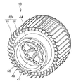 また、図7,図8に示されるように、マグネット収容部材38の外周面には、複数の羽根58が形成され、このマグネット収容部材38と複数の羽根58とでファン部材60が構成されていても良い。つまり、上述のブラシレスモータ10(図1参照)は、ファンモータとして構成されていても良い。