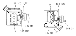 例えば、主軸アタッチメントは、フライスカッタを取付けたアンギュラアタッチメントに限らず、図19に例示するような孔加工用の刃具(例えばドリルやリーマ)110を取付けた多軸アタッチメント111であっても良い。多軸アタッチメント111は、主軸の軸心回りに180度旋回することで、刃具110の配置が左右対称になる。尚、加工箇所はワークWによって、図19(a)のように加工面が相違している場合も有り得るし、同図(b)のように同一加工面内において加工部が異なる場合も有り得る。