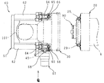 マシニングセンタ1は機台前方、すなわち主軸頭4の前方の加工領域外に、アンギュラアタッチメント30とダミープレート50を着脱可能に収納する収納装置55が設けられている。収納装置55は、アタッチメントクランプ装置20から脱着したアンギュラアタッチメント30を保持する為の主軸アタッチメント保持装置60と、アンギュラアタッチメント30を垂直面内で旋回させる旋回装置70と、アンギュラアタッチメント30と同様にダミープレート50を保持するダミープレート保持装置75から構成されている。旋回装置70は、アンギュラアタッチメント30を所定の角度に旋回し、その取付姿勢を新たな取付姿勢に変更する主軸アタッチメントの旋回手段である。主軸アタッチメント保持装置60は、旋回装置70に取付けられて旋回するようになっている。