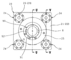 一方、主軸アタッチメント30は刃具107への回転伝達が主軸7のテーパー孔7に装着するクラッチツール(動力伝達工具)90を介して行われ、主軸アタッチメント30を使用しない時は、クラッチツール90のみを工具マガジン14に収納し、クラッチツール90は工具マガジン14に収納した他の工具TとATC装置5で交換可能である。