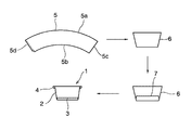 上記の容器1を成形する工程の概略を図13に示してある。先ず、胴部2は、片面もしくは両面に合成樹脂フィルムを両面にラミネート(もしくはコーティング)したブランク5を筒状に丸めて構成されており、そのブランク5はカール成形する前の胴部2を平面に展開した形状すなわちシート状の板紙であり、扇状に開いた(湾曲した)帯状を成し、その幅は容器1の高さ程度になっている。そのブランク5を切頭円錐状に丸め(少なくとも内面側を樹脂面として丸め)、その両端部を重ね合わせて接合することにより筒状のシェル6が成形される。そのシェル6の内部に底紙7が挿入されてシェル6の底部近くに接合される。すなわち、底紙7は、上記のブランク5と同様の板紙を素材とした円盤状の部材であり、その外周部には下向きに折り曲げて形成されたフランジ部が設けられている。この底紙7が挿入されたシェル6の下端縁を内側にカール成形して底紙7のフランジ部を巻き込んで接合することにより底紙7がシェル6に固定される。なお、上端部側のカール部4は底紙7を固定した後に成形される。