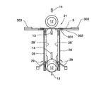そして、図10に示すように、前記テーブル302の下方には、マンドレル12が図の下側に移動することに伴って、ブランククランプ13によって挟み付けられたブランク5の左右両側を相対的に押し上げて、ブランク5をいわゆる「U」の字状に曲げるブラシ付きガイドバー28,28がブラシ28’,28’を内側に向けて設けられている。なお、ブラシ28’,28’はブランク5の傷付きを防止するためのものであり、適宜の軟質材に置き換えてもよい。このガイドバー28は、下側に移動するマンドレル12の外周面とブラシ28’とが接触する程度に間隔を空けてマンドレル12の左右両側に配置され、かつマンドレル12の大径側と小径側のそれぞれに所定の間隔を空けてほぼ平行に配置されて固定された複数の帯状(もしくは棒状)の部材によって構成されている。そして、そのガイドバー28は、前述したフィーダー22の先端側にある給紙位置21におけるブランク5のテーブル302下面を上端(始端部)とし、ここからマンドレル12の旋回方向にその旋回半径とほぼ等しい半径で湾曲した円弧状に形成されている。すなわち、給紙位置21に位置決めされているブランク5をマンドレル12が押し下げることにより、ガイドバー28がそのブランク5の両端部を相対的に押し上げ、その結果、ブランク5をその外周面を傷付けることなく「U」字状に湾曲させるように構成されている。