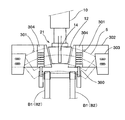 一方、前述した給紙位置21にはブランク5を所定の位置および姿勢に位置決めするための位置決め手段が設けられている。すなわち、図9に示すように、フィードベルトB1,B2の先端側には、マンドレル12の下側近傍まで送られたブランク5を最終的にマンドレル12の真下まで短いストロークで押し込み、ストッパー301に当てて位置決めさせる押し込み爪300がマンドレル12の左右両側に設けられている。それらの押し込み爪300は、適宜のアクチュエータによって軸300′(図7参照)を中心に前後方向に移動させる構成にしてもよいが、ターレット10の回転など他の機構との連動を確実に行うために、ターレット10を回転させる駆動力をカム機構などの適宜の運動機構によって各押し込み爪300に伝達するように構成することが好ましい。また、その給紙位置21の左右両側には、前記フィーダー22により送られてくるブランク5を給紙位置21に保持させるテーブル302が設けられており、ブランク5の両端部の樹脂被膜が溶融もしくは軟化した状態にあるため、ブランク5の両端部がテーブル302表面に直接接触しないように、テーブル302の上面には、ブランク5の両端部を僅かに浮かせて保持するために少し凸状に形成された吸引部304がマンドレル12の左右両側に設けられている。なお、この吸引部304の表面には、吸着力をブランク5の下面に付与し、ブランク5をほぼ平らな姿勢で保持するための吸引孔が複数形成され、図示しない真空源と連動している。また、ブランク5の左右両側の位置決めを行うサイドガイド303が位置調整可能に設けられている。