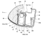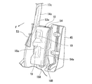 なお、カバー部材45の裏面(第1の荷重伝達ブロック18の後面に対向する側の面)には、図13に示すように、上下方向に延出する補強リブ59が設けられている。この補強リブ59は、カバー部材45が第1の荷重伝達ブロック18に固定されたときに、外側支持ワイヤ154の各係止フック154bの付根部の内側の近傍に配置され、各係止フック154bの開口58方向への変位を規制する。