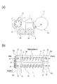 図2(b)は、現像装置1を上方から見た断面図である。静電像を現像した後の現像スリーブ3上の2成分現像剤は、現像スリーブ3の回転に従って搬送され、現像剤容器2の内部に回収される。現像剤容器2の内部に回収された現像剤は、第1スクリュー2a(現像スリーブ3に近い側)、第2スクリュー2b(現像スリーブ3から遠い側)の2本のスクリューによって、再び現像剤容器2の内部を循環し、混合撹拌される。ここで、現像剤循環の方向は、第1スクリュー2a側では図2(a)中の奥側から手前側に向かう方向であり、第2スクリュー2b側では図2(a)中の手前側から奥側に向かう方向である。