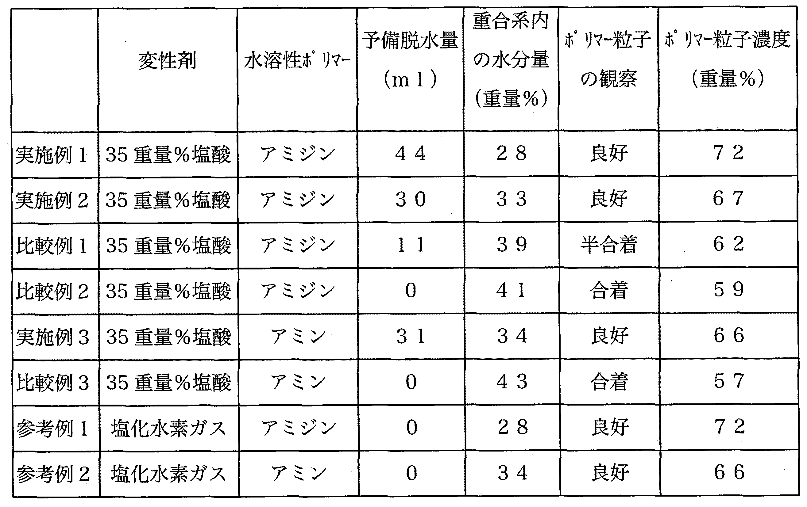 実施例1において、予備脱水を行わず、塩酸の代わりに塩化水素ガス24.0gを使用して変性反応を行った以外は、実施例1と同様に操作してアミジンの製造を行った。反応中、反応液はスラリーを維持し、フラスコの壁などへの粒子付着や粒子同志の合着は起こらなかった。更に、取得した重合体は良好な水溶解性を示した。表1に上記の結果をまとめて示した。