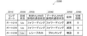 制御VLANの論理的通信状態2230は、当該ポートの制御VLANの論理的通信状態を表す。論理的通信状態は、VLANに属するポート毎に存在し、送信不可・受信不可の"ブロッキング"、送信可・受信可の"フォワーディング"、送信不可・受信可の"レシーブのみ"の3値で管理する。論理的通信状態の初期値は増設ポートの場合は"レシーブのみ"、増設ポート以外の場合は"フォワーディング"となる。隣接ノード200の制御VLANの論理的通信状態2230は、ポート210、ポート220が"フォワーディング"、ポート230が"レシーブのみ"となっている。