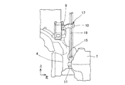 更にまた、前記第1、第2ガイドロッド19、20は下方に開口する第1、第2孔部27、28を夫々備え、前記第1、第2ガイドロッド取付部21、22は前記第1、第2孔部27、28の内側に挿入される第1、第2軸部29、30とこれらの第1、第2軸部29、30の下端部から径方向外側に広がる第1、第2テーパー部31、32とを夫々備えている。