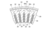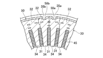 固定子コア30は、円筒形状に成形された固定子巻線40に対して、外周側からティース部33が挿入された所定数の分割コア32により円環状に組み付けられている。これにより、固定子巻線40は、図2に示すように、各導線45の所定のスロット収容部が固定子コア30の所定のスロット31内に収容された状態に組付けられる。この場合、各導線45のスロット収容部は、所定のスロット数(本実施形態では3相×2個(倍スロット)=6個)ごとのスロット31に収容されている。また、導線45の隣り合うスロット収容部同士を接続しているターン部は、固定子コア30の軸方向の両端面30aからそれぞれ突出し、その突出している多数のターン部により、固定子巻線40の軸方向両端部にコイルエンド部42が形成されている。