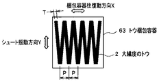 - 偏平形態をした総繊度が18,000〜210,000dtexの炭素繊維前駆体トウを揺動シュートを介して梱包容器に振り込みながら、梱包容器をシュートの揺動方向と直交する方向に往復動させて、梱包容器の折り返し地点ごとに振り込まれたトウにプレスを行い圧縮する炭素繊維前駆体トウの梱包容器への収納方法であって、