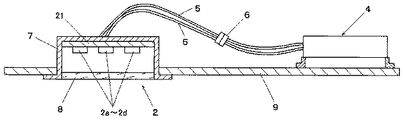 LED発光部2は、4個のLED2a〜2dが搭載されており、LED2aからLED2dまでがアノードからカソードに直列につながれる構成となっている。LED2aのアノード側にはプラス、LED2dのカソード側にはマイナスの電圧が印加されることにより、各LED2a〜2dが発光する。LED2a〜2dの順方向電圧Vfの合計以上の電圧が印加されると、流れる電流の値に応じてLEDから光束を得ることが出来る。順方向電圧Vfは通常略3.5Vのため、4個直列に接続するのであれば、4×3.5V以上の直流電圧において点灯させることが出来る。