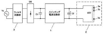 本発明の基本構成を図1に示す。Vsは商用交流電源、DBは全波整流器、C1,C2はコンデンサ、1はスイッチング素子を含んだスイッチング電源回路部、2はLED発光部、3はフィルタ回路部である。LED発光部2の消費電力は例えば20W以下である。