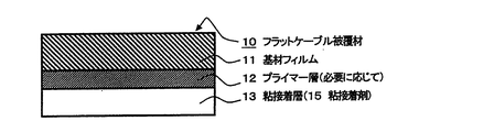 本発明によるフラットケーブル被覆材10は、図1に示すように、基材11と、基材11の一方の面上に設けた粘接着層13とを少なくとも含む。本発明においては、基材11と粘接着層13との間に、接着力を向上させるために、必要に応じてプライマー層12を設けてもよい。また、フラットケーブル被覆材10は、使用時(すなわち、被覆材を貼り合わせてフラットケーブルを作製する際)までの保存や、使用時の取り扱い性の点から、粘接着層13面へ剥離紙(図示せず)を積層しておいてもよく、基材11/粘接着層13/剥離紙の構成としてもよい。