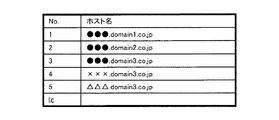 また、情報登録手段2は、自己のホスト名とDDNSサーバ1a、1b・・・のIPアドレスを管理する登録側サーバ記憶部7を有している。情報登録手段2は、登録側サーバ記憶部7に対する情報登録手段2のホスト名の登録と、この登録先に対応するDDNSサーバのIPアドレスの登録とを情報登録手段2のユーザから入力されるようになっている。登録側サーバ記憶部7は、情報登録手段2に割り当てられたホスト名とDDNSサーバ1a、1b・・・のIPアドレスを対応付ける管理テーブルによって登録先を記憶する。その管理テーブルは、例えば図1、図3に示すように、情報登録手段2に割り当てられたホスト名(図中の項目名「ホスト名」)、ホスト名を登録するDDNSサーバのIPアドレス(図中の項目名「DDNSサーバアドレス」)を所有している。情報登録手段2のホスト名は、TCP/IPネットワークのフルドメイン名(FQDN)とする。登録側サーバ記憶部7は、管理テーブルによって、情報登録手段2に割り当てられた全てのホスト名について、ホスト名ごとに登録先を記憶する。また、管理テーブルは、図1の暗号器6で得られた暗号文を複数の登録先に分散登録するために用いる順序情報(図3中の項目名「No.」)も所有している。例えば、図3中「No.1」の登録先は、図3中「●●●1.co.jp」のホスト名と、これを登録する図1のDDNSサーバ1aのIPアドレスである図3中「10.10.1.1」を対応付けた情報になっている。図示例の登録先No.1〜No.3は、3個のホスト名と、3個のDDNSサーバのIPアドレスとの1対1の組み合わせ、登録先No.4〜No.5は、2個のホスト名と、1個のDDNSサーバのIPアドレスとの組み合わせの関係にあり、5個のホスト名に係る登録先No.1〜No.5によって接続情報5の暗号文を3個のDDNSサーバ1a、1b・・・に分散登録することを前提にしている。