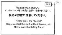 例えば、第4の実施形態のATM100Cにおいて、第1の詐欺注意喚起画面を、図15に示すような内容に置き換えるようにしてもよい。また、例えば、第4の実施形態のATM100Cにおいて、第2の詐欺注意喚起画面を、図16に示すような内容に置き換えるようにしてもよい。図15、図16では、日本語で表記された振込め詐欺の注意喚起等を行うメッセージと、英語で表記されたメッセージ(同画面の日本語表記のメッセージを英語に翻訳した内容)とが併記されている。 For example, in the ATM 100C of the fourth embodiment, the first fraud alerting screen may be replaced with the contents as shown in FIG. Further, for example, in the ATM 100C of the fourth embodiment, the second fraud alerting screen may be replaced with the content shown in FIG. In FIGS. 15 and 16, a message for alerting a transfer fraud written in Japanese and a message written in English (contents translated from Japanese on the same screen in English) are shown together Has been.